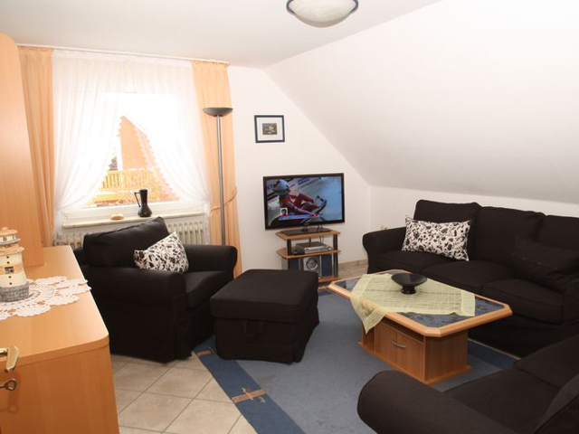 Die Obergeschoss-Wohnung hat eine Wohnfläche von 65qm mit2 Schlafzimmern, 5 Betten sowie einem Kinderbett, ein großes Wohnzimmer,